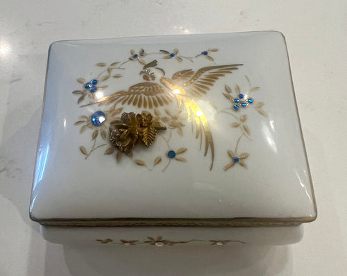 Vintage Porcelain Brass Dresser Box with Rhinestones & Bird Design